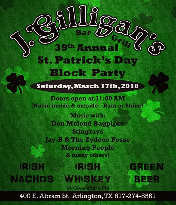 Celebrate St. Patrick’s Day in Arlington tradition at J. Gilligans Bar and Grill with Green Beer and Irish Nachos. Performances include favorite locals such as: Don McCloud Bag Pipes, Stingrays, Jay B & Zydeco Posse, Morning People and much, much more.