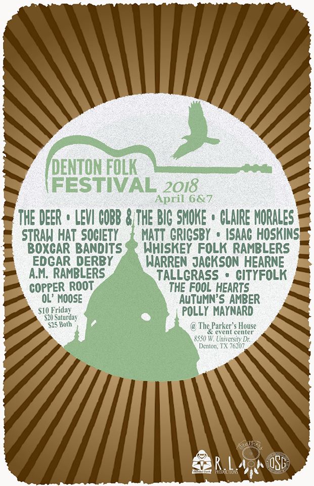 The second annual Denton Folk Festival is coming up on April 6th and 7th! This year the fest will be taking place at The Parker Plantation and Event Center, which is 5 miles from the Denton square, straight down West University. Friday will be from 5PM until midnight, Saturday will start at noon with a children’s show and also go until midnight. Tickets are $10 Friday, $20 Saturday, or $25 for both! Reserve your tickets today! This will be a BYOB event.
