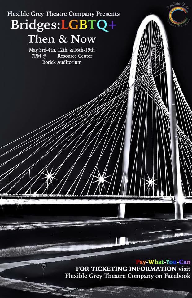 "Bridges" was created to try and bridge the gap between the Millennial generation of LGBTQ+ individuals and our predecessors who helped pave the way for us. We’ve asked the younger generations to send us questions that they would want to ask older LGBTQ+ individuals, then sought out those individuals to interview. Flexible Grey has devised a performance where the Millennial LGBTQ+ generation presents portions of these interviews in a monologue night that sheds lights on the untold stories from everyday members of our wonderful and diverse community. In addition to the show, we hope to archive the stories, forming a script/anthology that can be accessible for all LGBTQ+ individuals, emerging generations and beyond. Join us at Resource Center, and lets reclaim our history as a foundation for a better future.