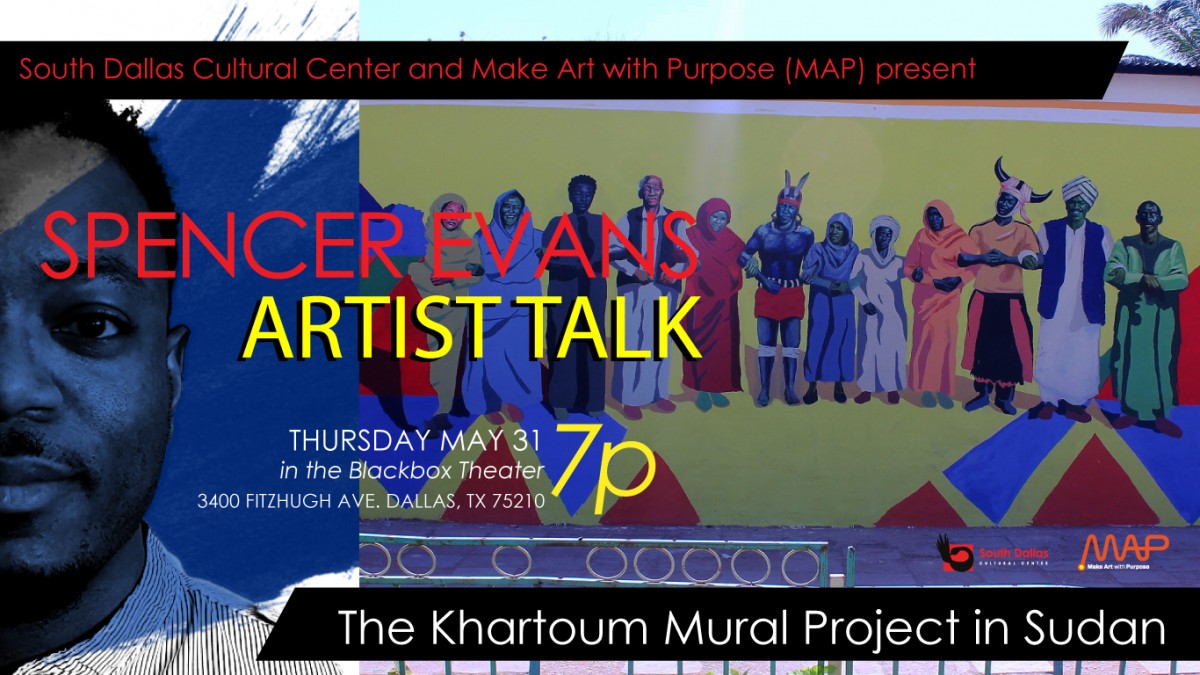 South Dallas Cultural Center and Make Art with Purpose (MAP) present artist Spencer Evans in a talk about his recent work in Sudan as part of MAP’s Khartoum Mural Project. Evans will show images from the project and talk about how his work in Sudan ties into his larger project addressing Africa and the African Diaspora.