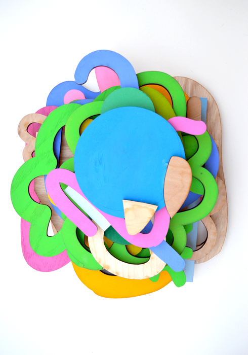 This exhibition is an exploratory installation of interacting objects designed in CAD software, such as SketchUp and Adobe Illustrator and cut-out using a laser cutter. The use of these programs help achieve a uniquely bold and precise object which is then further dramatized by Betsey’s over the top and bright color choices, which she associates with happy memories from her childhood.
