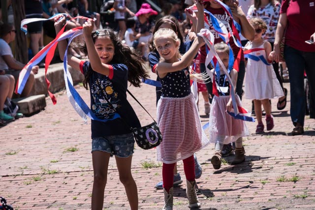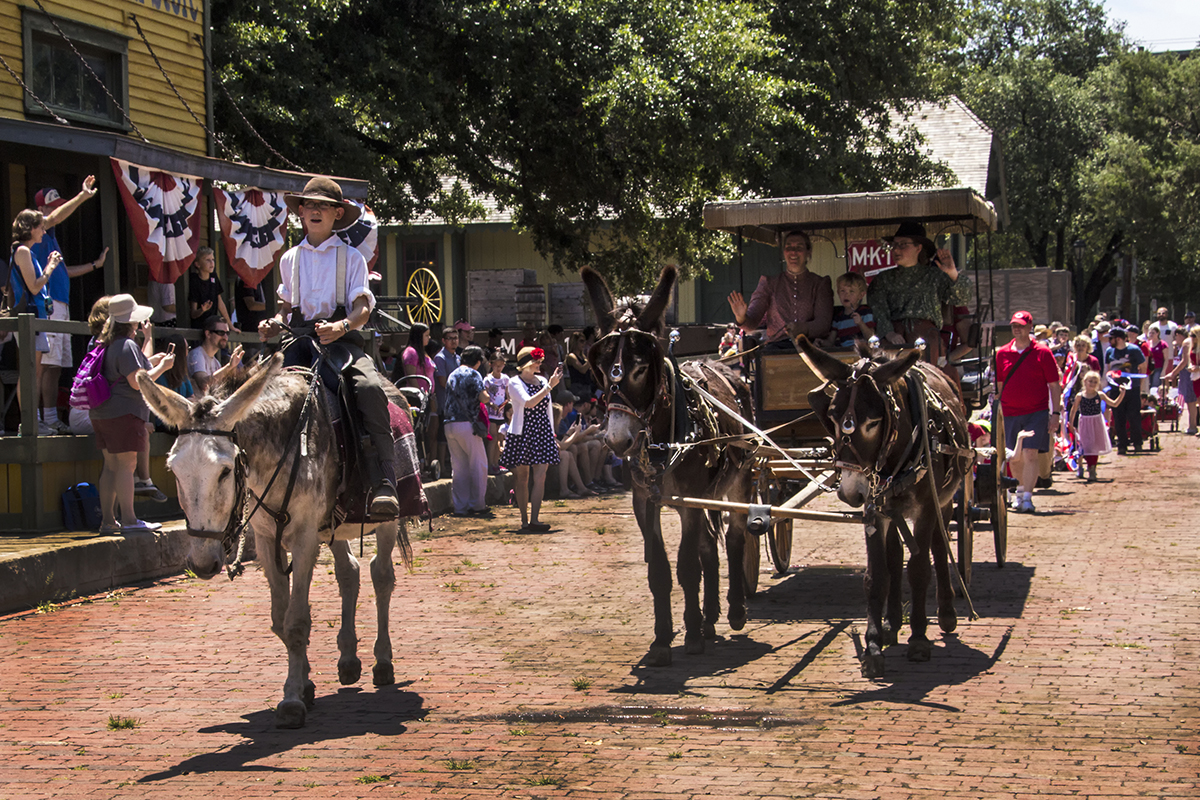 Kids may decorate their wagons and bikes at the craft station for the popular patriotic parade around the village at noon, or they may decorate themselves and march in the parade. The Junior Historians, teen volunteers at Dallas Heritage Village with a passion for history, will run the popular annual carnival which includes pick a duck, “go fishing” for prizes, bean bag toss, and the famous annual stick pony race for ages 3-11. Additional activities include historic games such as horseshoes, graces, and checkers. Guests may pose for patriotic pictures with Mammoth Jack Donkeys Nip and Tuck and Waylon and Willie. Throughout the village, musical performances will keep toes tapping.
