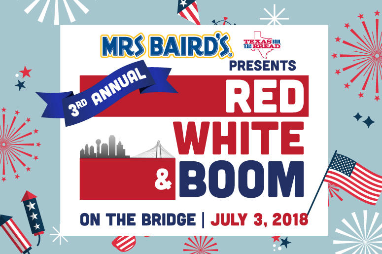 For the 3rd consecutive year, Mrs Baird’s “Texas Born Texas Bread” Presents the City of Dallas and 98.7 KLUV’s Red White and Boom on the Bride Tuesday night, July 3rd, 6-10 p.m.