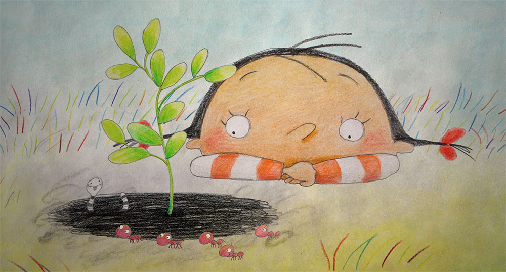 A little girl, delighted and intrigued by a hole, offers it all kinds of presents and treats.