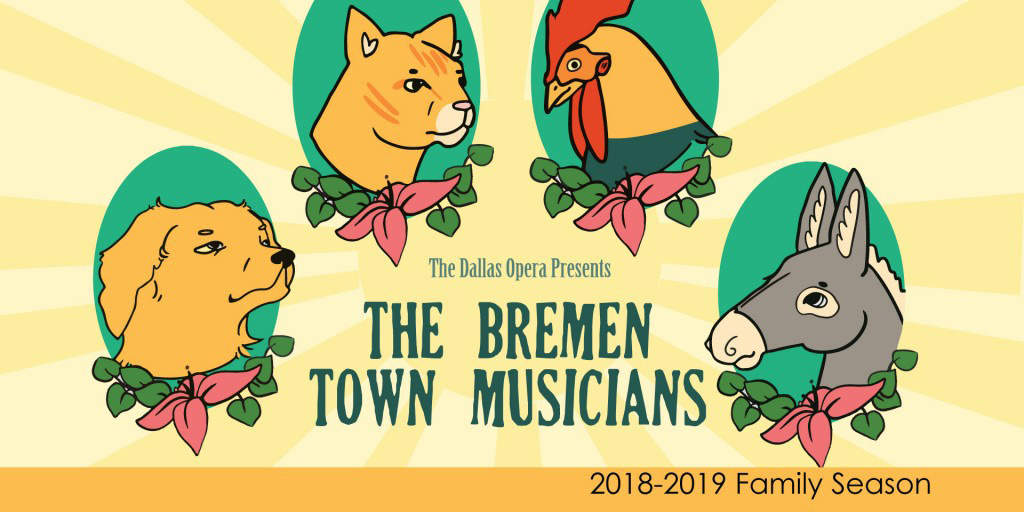 The Dallas Opera’s exciting new production, The Bremen Town Musicians, is an operatic version of the Brothers Grimm classic fairytale set to music by Rossini, Donizetti, Offenbach, Arthur Sullivan and Verdi. This children’s opera tells the tale of a rooster, dog, cat, and a donkey whose paths cross on the way to the town of Bremen.