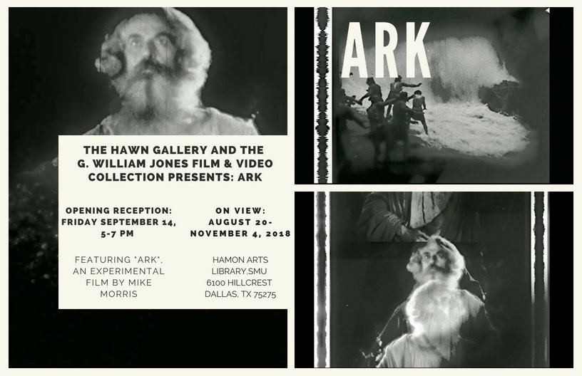 ARK is a cinematic installation featuring a film by Michael A. Morris made from archival 35mm film prints held in the G. William Jones Film and Video Collection. This work is installed on a looping film system devised by the Collection’s Jeremy Spracklen and Scott Martin, and in conjunction with Brad Miller from Film-Tech Cinema Systems. The looping film is a new mosaic of images and sounds created by contact printing and hand processing of short lengths of films selected from the archive. Highlighting the mechanics of projection typically hidden from the viewer, the space of the Hawn Gallery performs as a small cinema. The metaphor of both Noah’s Ark and the Ark of the Covenant serves as a parallel for the archive as it rescues hundreds of films from the deluge of time. These films are reactivated by bringing them back into the light and onto the screen in a new looping film installation. Such assemblage embodies our cinematic heritage. For more information, contact Hawn Gallery at [email protected] or 214-768-1383.