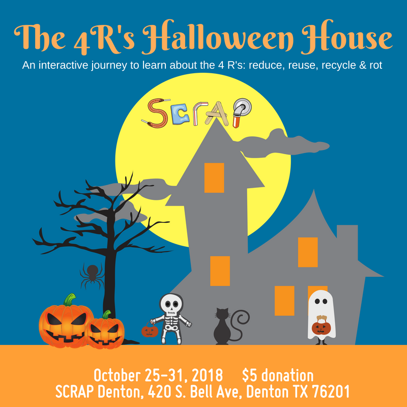 A fun and interactive experience to learn about the 4R's: reduce, reuse, recycle and rot. Suggested donation to enter the halloween house is $5 at the SCRAP Denton location. Free entry on Oct. 31 if you are wearing a costume!