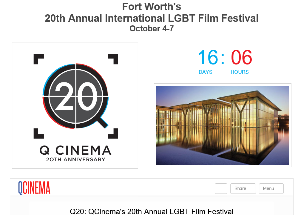Q Cinema is celebrating the twentieth anniversary of the annual Fort Worth Q Cinema Film Festival.Our mission is to provide a voice for gay, lesbian, bisexual and transgendered persons by presenting films, videos and live programs that not only represent the diversity of our community but educate, enlighten and entertain us all.General admission to the opening night centerpiece film. Cash bar a the Modern Art Museum of Fort Worth. *Reception with filmmakers for sponsors and VIP badge holders catered by Bon Appétit at The Modern Art Museum of Fort Worth. Enjoy our closing night film and awards ceremony at the Botanic Garden, Fort Worth. The awards ceremony includes a live performance by the Fort Worth Opera and reception with the filmmakers. Reception includes donation bar and catering by City Kitchens.