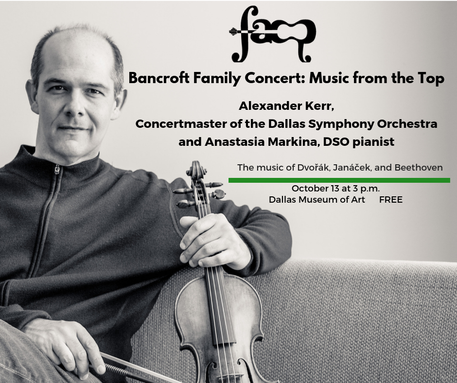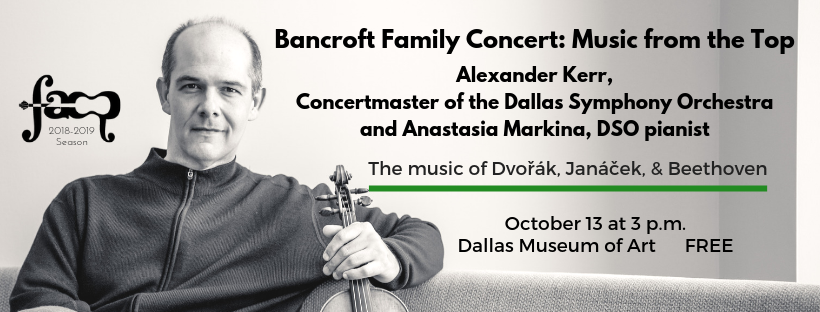 HOW: The Bancroft season is bookended by key Dallas Symphony Orchestra (DSO) personnel Alexander Kerr and Nathan Olson, and FACP is honored to have several preeminent members of the DSO, The Dallas Opera Orchestra, and the Fort Worth Symphony Orchestra (FWSO) featured throughout the series – truly a celebration of musical families and FACP’s friends. The season opens with DSO Concertmaster Alexander Kerr joined by DSO pianist Anastasia Markina and closes with DSO Co-Concertmaster Nathan Olson’s Baumer String Quartet.
