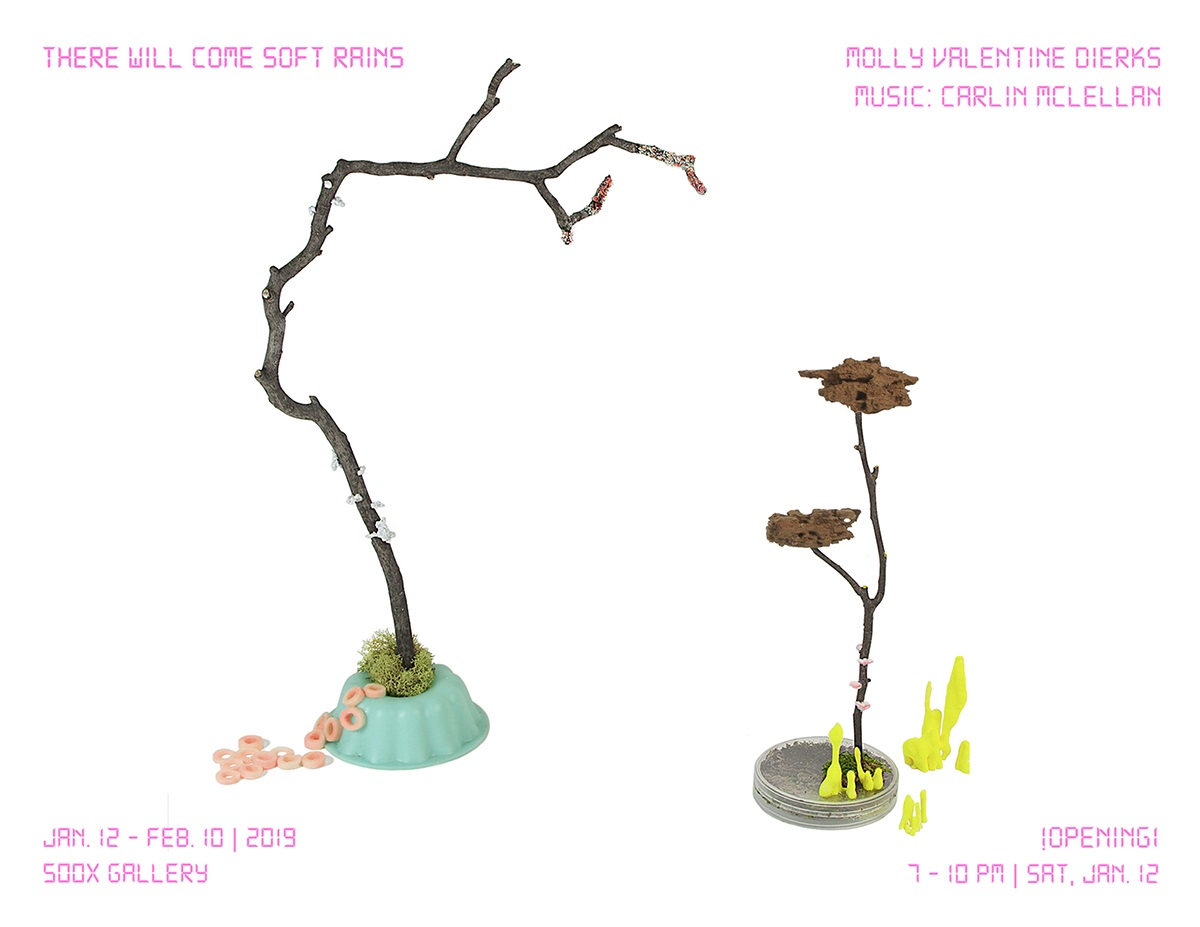 Featuring new futuristic miniature ecosystems by Molly Valentine Dierks, 'There Will Come Soft Rains' merges the natural and constructed to explore alienation and desire in post-industrial society. Synth-pop sound environments mix computer-read poetry with ambient music by collaborator Carlin McLellan. Titled after Sara Teasdale and Ray Bradbury’s eponymous poem and short story, the visual and sonic scores use the rhythms of nature to imagine a post-apocalyptic landscape of healing.