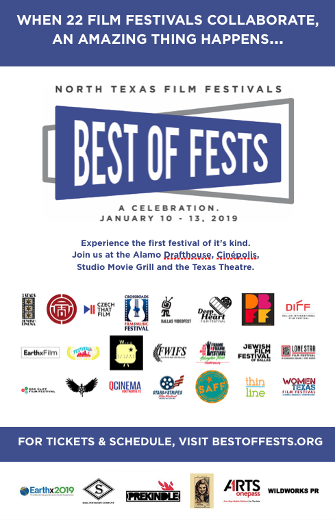 Film festivals based in Dallas, Forth Worth, and North Texas have joined forces for the first time to present a Best of Fests film festival on January 10-13, 2019. Twenty-two different film festivals will present films that either were popular with their audiences or represent their programming esthetic. The films will be screened at venues across Dallas that include Alamo Drafthouse Cinemas, Cinépolis Luxury Cinemas, Studio Movie Grill, and the Texas Theatre,