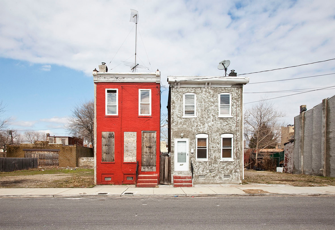 The photo essay, Last House Standing, by German-born artist, Ben Marcin, is represented in this group show. Marcin documents isolated, decaying two and three-floor walk-ups found in Baltimore and Philadelphia. The old buildings stand alone on the street, waiting next in line to be demolished. The old-age metaphor is quite graphic.