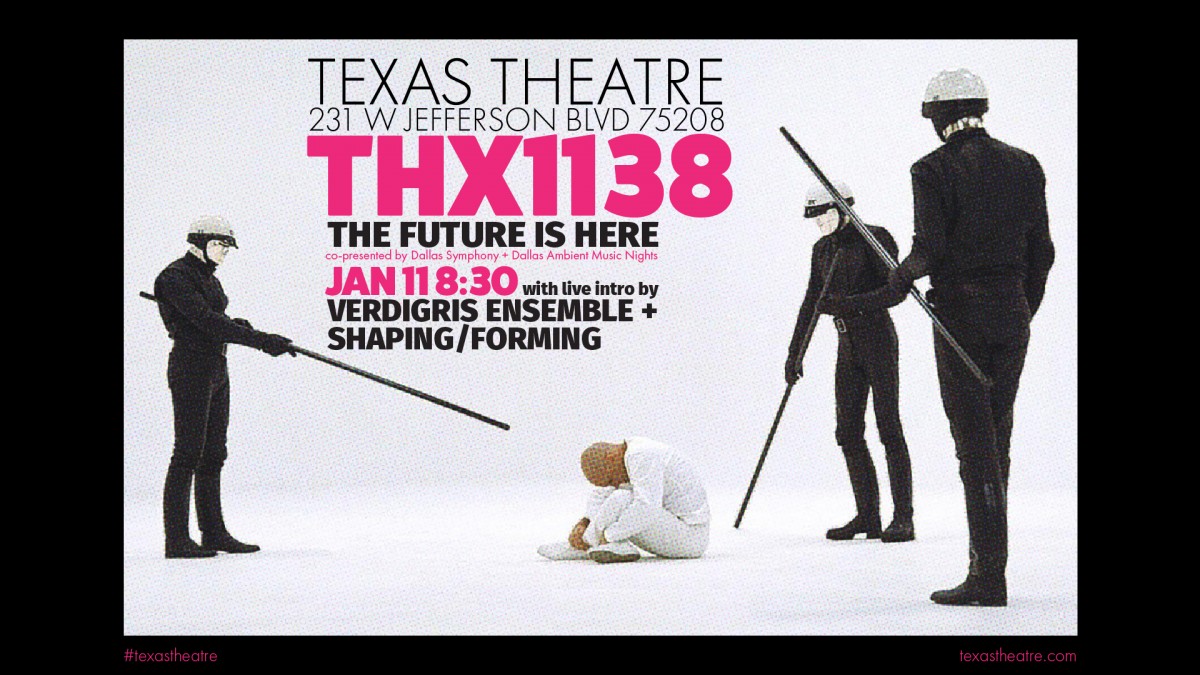 George Lucas’s first feature – 1971’s THX 1138 – returns to the Texas Theatre in a directors cut 35mm presentation with special Live on-stage Pre-show performance by The Verdigris Ensemble + Shaping/Forming.
