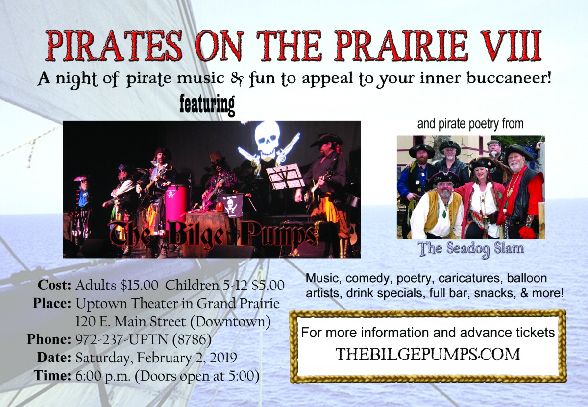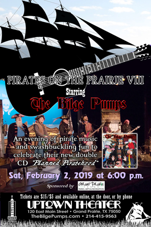 The concert will feature the Official Pirates of Grand Prairie, the Bilge Pumps, in an event to appeal to everyone's inner buccaneer. This concert will serve as the CD Release Party for the newest album from the Bilge Pumps, "Planned Piratehood", the long-gestating double-CD from which the band will be performing two sets worth of material.