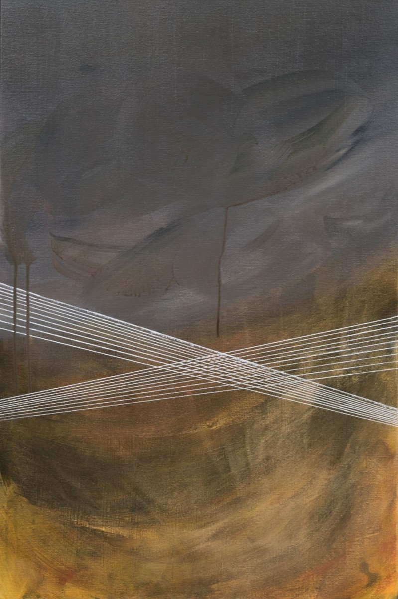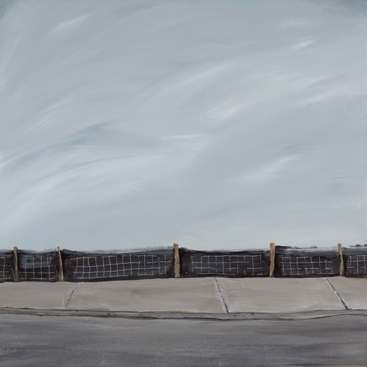 Barriers are ubiquitous in our world. They exist in fences between neighbors, against swaths of land guarded by barbed wire, and in skies blocked by miles of electrical wires. Morin’s work heightens our awareness of these obstructions through her focus on the commonplace. Construction barriers, chain link fences, ornate wrought iron gates, orange hazard barrels, and electrical wires block our physical and psychological experience of the world. Simultaneously, Morin’s subject matter contrasts with her romanticized treatment of surface and color in the work. “Seas clash, storms pour over sun-soaked fields, structures reach up and out, and stars brighten vast stretches of space. The viewer is simultaneously lured into these worlds and barred from the full experience, resulting in tension.”