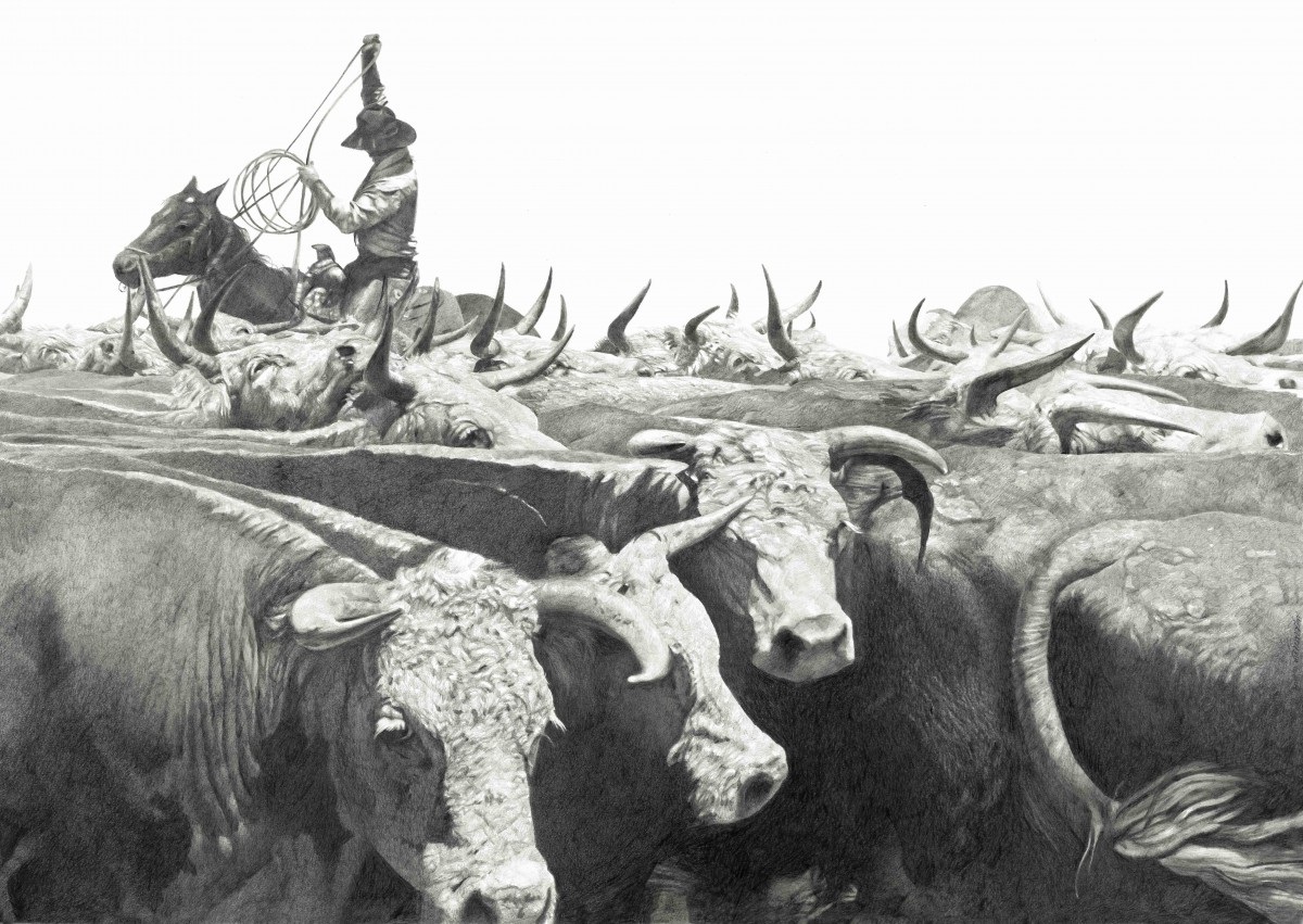 With "Works on Paper | Texas Drawings," Woodrow Blagg exhibits technically marvelous and awe-inspiring graphite works on paper that herald the symbiotic relationship between the Texas rancher and their environment. Recalling the epic depictions of the West in early American art, but posed in contrast to their common themes of domination and struggle, the subjects in Blagg’s work are representative of the responsibility and dedication to land and animal stewardship assumed by these working men. The expansive drawings are a modest tribute to an enduring presence and legacy to the way of living on some of the great Ranches throughout Northwest and West Texas, including the Waggoners, the 6666's the Pitchforks, the Beggs Ranch in Post, TX and the Quien Sabe Ranch near Channing, TX. Woodrow Blagg, the brother of Fort Worth-based artists Dennis and Daniel Blagg, is represented in many high-profile collections including the private collection of President and Mrs. Ronald Reagan, Mr. and Mrs. Ralph Lauren, and BMW Auto Works.