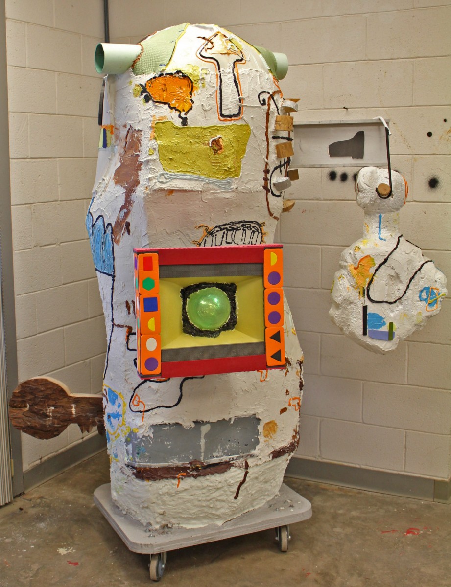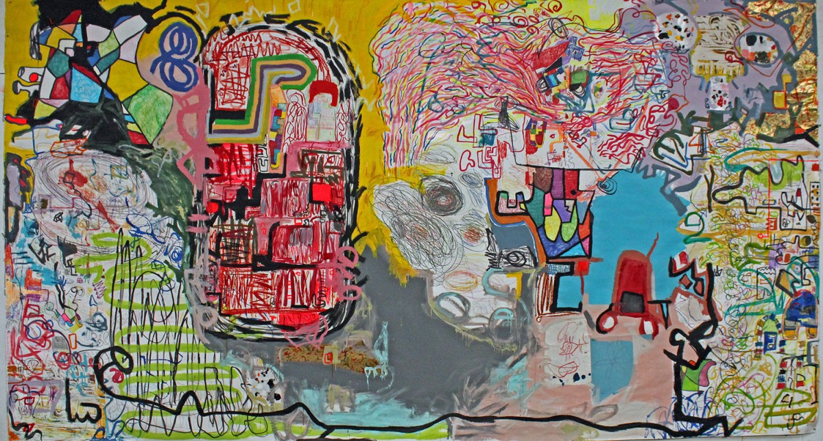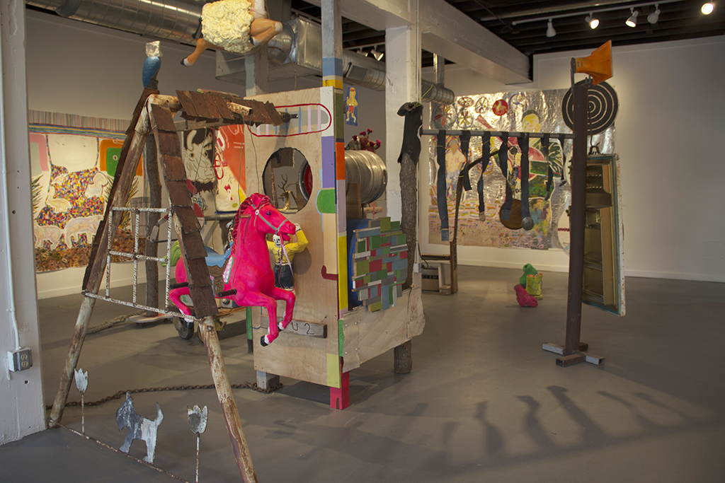I searched through my junk pile for scrap metal and broken truck parts. I walked into the woods, gathered stones and cut down trees. I pulled out my toy box from the attic. I brought all these odds and ends into my shop and with a hammer in one hand and a brush in the other I started to bang things together and sling wet paint. I pulled out all the stops. I lost track of time and forgot who I was. I dug up all the old memories; wiped the tears from my eyes and started telling stories. This exhibition is the result. It’s a no holds barred, bare-knuckled, greased pig hootenanny jamboree death match. Close your eyes and open your heart. The world is hard on the little things. Take it all in and don’t be afraid to let it all hang out. Just remember; enter at your own risk cause in this show “WE DON’T DIAL 911".