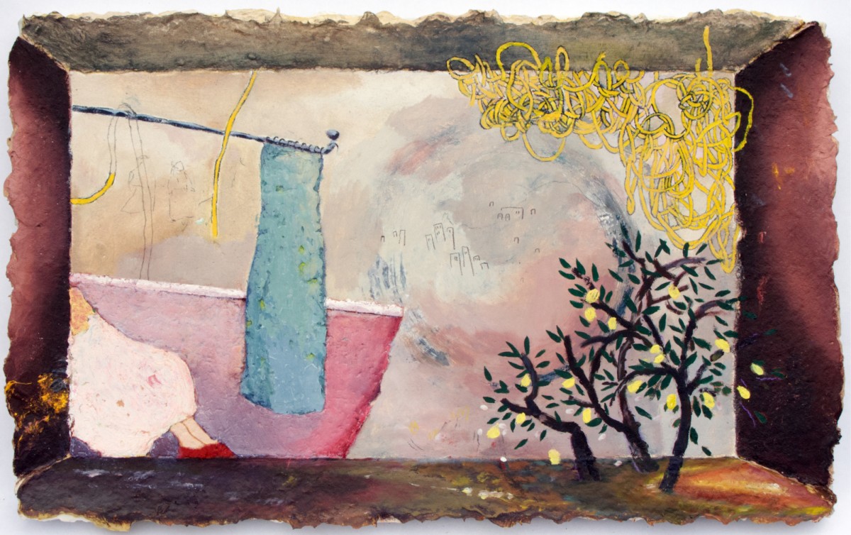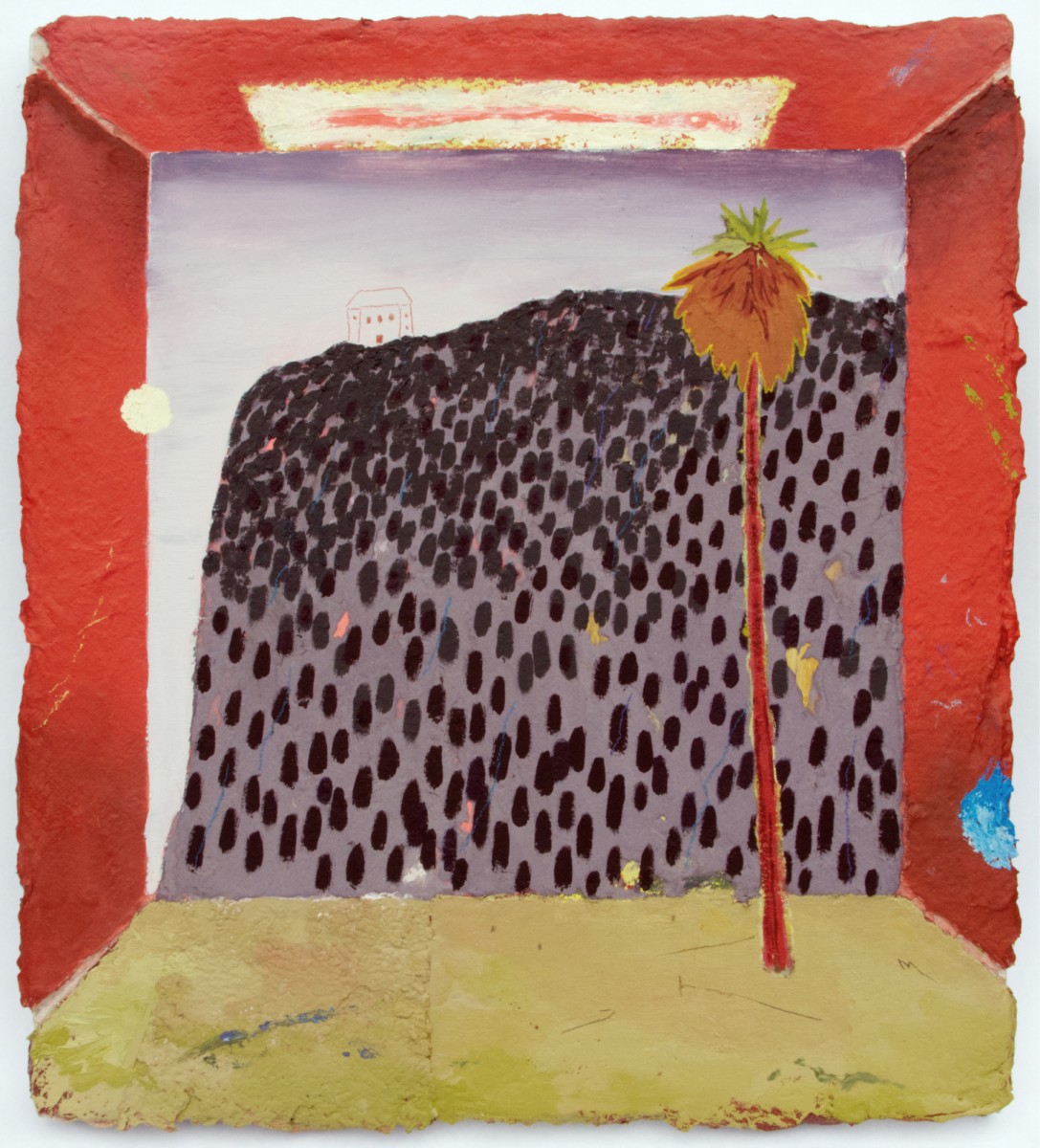 Each artwork acts as both a shallow one-point perspective room and a framed image, with the rear wall of the room acting as a surface to play out questions about what our relationship to the outside world becomes when we are removed from it, confined to an interior. It could be memory, fantasy, attempts to orient oneself and find a place to belong, or methods of bringing the natural world inside. Repeated motifs—hill shapes, obscured or abraded map images, tangled forms—echo between different works, suggesting a preoccupation with the imagery itself rather than the faithful depiction of a specific space. This work continues Martin’s use of paper pulp plaster applied to canvas with a variety of techniques. The materiality of the paper pulp plaster allows for a wide variety of moves—sculptural relief, painting, drawing, etching, and cutting—to find compelling ways of building up a surface and image. Some objects edge towards illusion, others are drawn on the surface and fail to fully form, and certain parts rise from the surface three-dimensionally, creating a playful dissonance in the represented space.