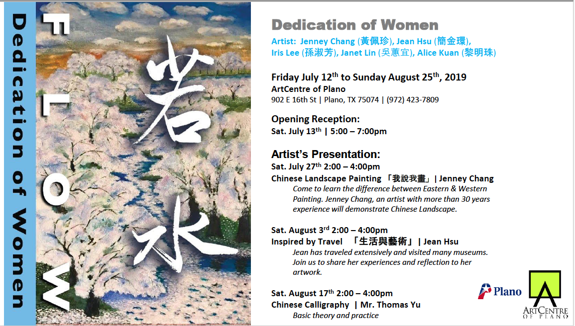 The ArtCentre of Plano proudly announces the opening of an exciting new exhibition featuring the works of five artists influenced by Chinese art. Entitled FLOW: The Dedication of Women, the exhibition will open on July 12, 2019, and run through August 25, 2019.