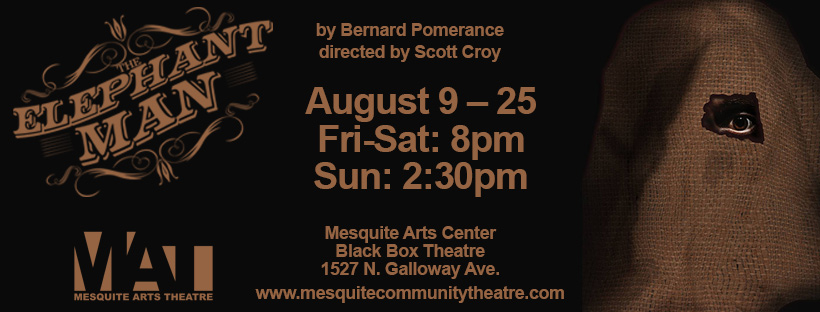 The Elephant Man runs for nine performances in the Black Box Theatre in the Mesquite Arts Center, located at 1527 N Galloway Ave. Mesquite, Texas 75149 from August 9th - August 25th. Performances are Friday and Saturday evenings at 8:00 pm, and Sunday afternoons at 2:30 pm.