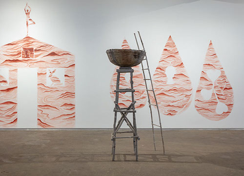 Watchtowers, Keys, Threads, Gates is a large-scale installation by Francesco Clemente consisting of a site-specific mural and two series of sculptures produced in the artist’s signature dreamlike aesthetic, and which reflect his ongoing exploration into notions of movement, transition, vulnerability, and mythological narratives. Recurring motifs of ladders, labyrinths, gates, doors, and keys, among other representative symbols, reference the condition of existing in a liminal space through which one eventually passes or remains caught in a balancing act.