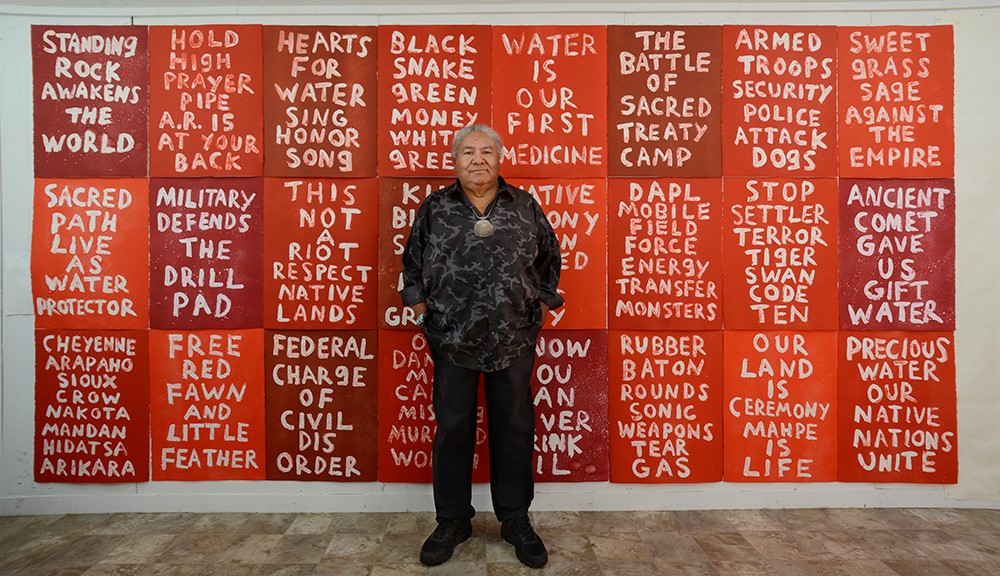 Hock E Aye Vi Edgar Heap of Birds is an artist and an advocate for indigenous communities worldwide. His text-based work includes multidisciplinary forms of public art messages, large-scale drawings, Neuf Series acrylic paintings, prints, works in glass, and monumental porcelain enamel on steel outdoor sculpture. His most recent works address injustices and current views of Native American people, illuminating the struggles within the lives of Native Americans, as well as acknowledging Native Americans’ cultural differences through coupling positive and negatives, the past and the present though language.