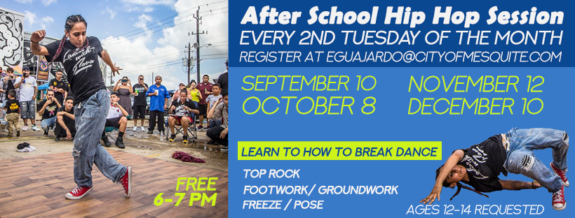 Please join us every 2nd Tuesday of the Month this Fall! If you have a child age 12-14 years old who wants to learn how to break', then this class is for you. Focusing on the fundamentals of breakin', this course will teach your child hip hop terms such as "Top Rock", "Groundwork", and "Pose". This is a FREE course and requires registration. Please contact Erica at [email protected] .