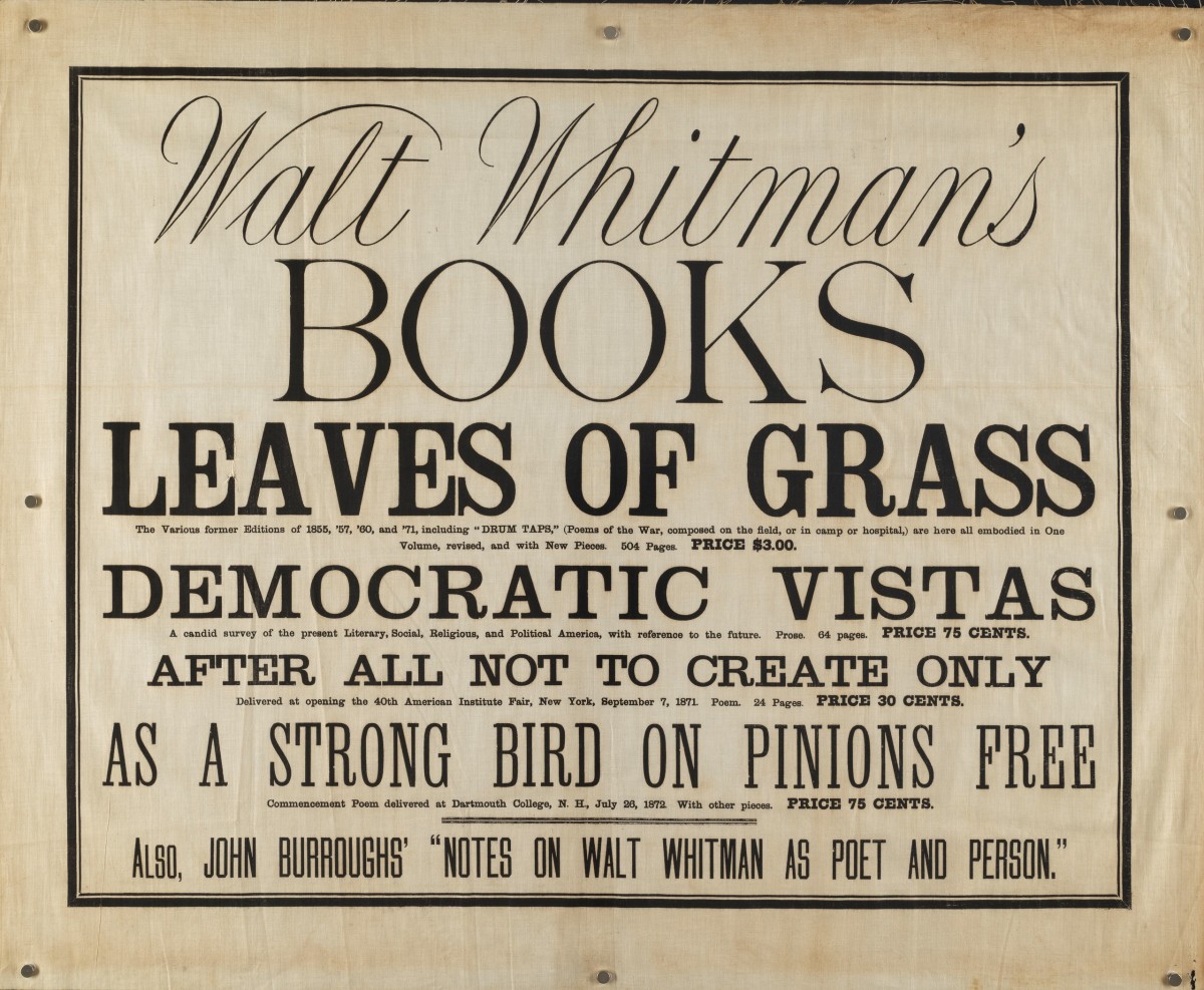 Highlights include every American edition of Leaves of Grass published during Whitman’s lifetime, starting with the 1855 edition, as well as important foreign editions and fine press editions and copies of first editions of Whitman’s other books. The exhibit also features original photographs, correspondence, and materials from Whitman’s household, including scrapbooks, ephemera, and a book from his library.