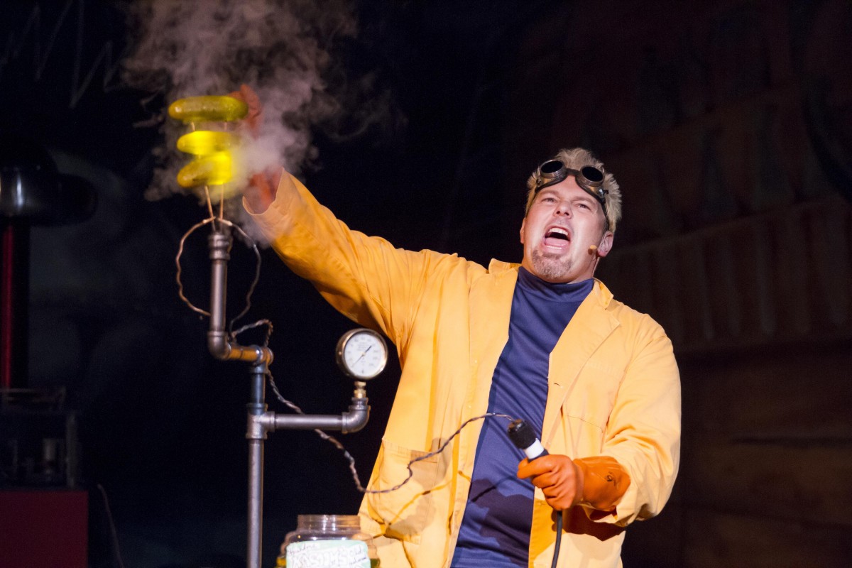 So much science, so little time. . . Doktor Kaboom is having trouble picking his favorite science demonstrations, so he’s bringing them all! Unfortunately there are way too many to do them all in one show. The solution: The Wheel of Science! Doktor Kaboom has built a great big spinning wheel and labeled it with everything from optical illusions to chemical reactions to a homemade hovercraft, and more! At least a dozen fantastic demonstrations ready to go. Wherever the wheel stops, that’s what’s next! Will we turn a water bottle into a rocket or catapult bananas across the stage? Electrocute a pickle or create artificial gravity? Who knows? No two shows will be the same. So, step right up, and let’s spin that wheel!