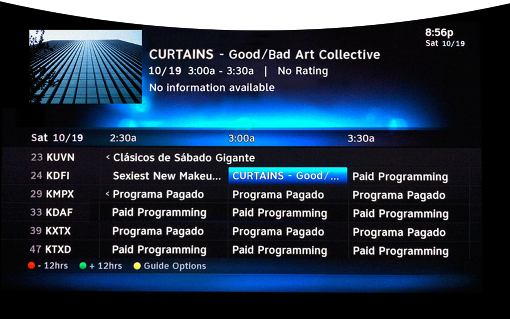 In the months leading up to the opening of XChange, the Collective will produce a 28-minute infomercial, which will be filmed in a newly created television studio on an empty floor of Bryan Tower, a downtown Dallas highrise managed by Spire Realty Group LP. At the opening event on Saturday, October 19, 2013, attendees will be given the opportunity to participate in the filming of the infomercial. Visitors throughout the run of XChange will be able to walk the space in which the infomercial was filmed and see sculptural elements used as props during the opening and in the finished infomercial, as well as select edits of video documenting the one-night event. The finished infomercial will be broadcast on late night and early morning television timeslots in local, regional, and national markets.