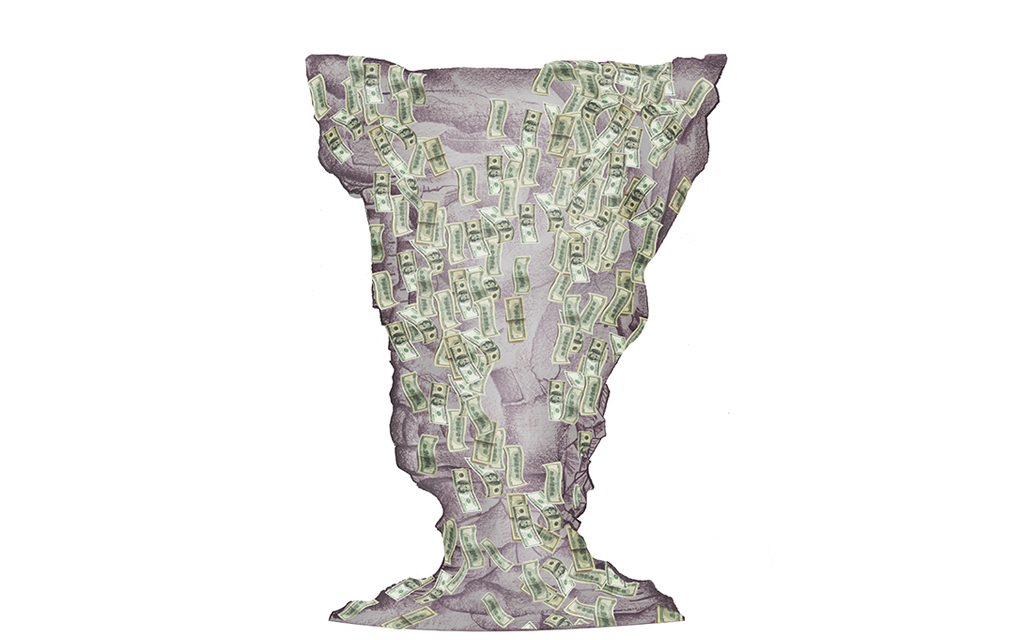 Projected images of sheets of dollar bills move serenely over the surface of a sculpted, head-like form, flowing like water, instantly adapting to every nook and curve, accompanied by an elegant soundtrack of moving water and paper. Three kiosks topped with iPads surround the form and offer an opportunity for visitors to donate money to one of three Dallas charities: Bookmarks, a branch of the Dallas Library, Dallas CASA and the North Texas Food Bank. After payment is tendered, visitors are encouraged to flick a virtual coin on the iPad screen toward the form, resulting in an exuberant splash.